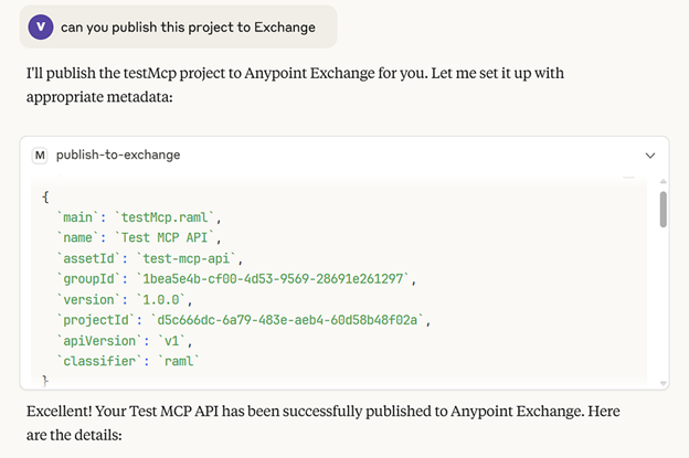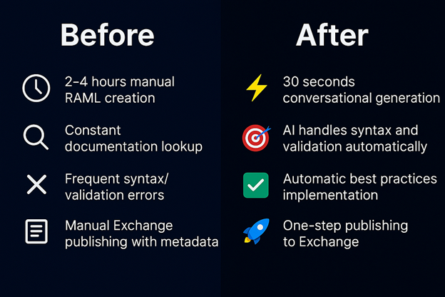Imagine opening Claude and saying: “Create a customer management API with CRUD operations and OAuth2 security” — and 30 seconds later, it’s published to Anypoint Exchange. That’s exactly what we built.