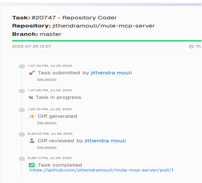 Key Intelligence: The real breakthrough? CurieTech AI doesn’t just generate code — it acts like a senior developer who never sleeps. After reviewing my changes, it automatically raised a PR with proper commit messages, branch naming, and merge strategies. No manual Git commands, no forgotten documentation updates. Just pure, intelligent automation that understands developer workflow.