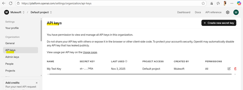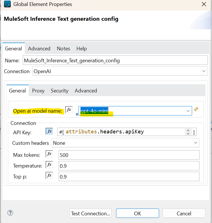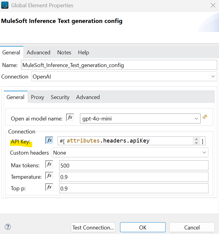 This ensures that the MuleSoft Inference Connector can securely authenticate and interact with OpenAI’s inference services.